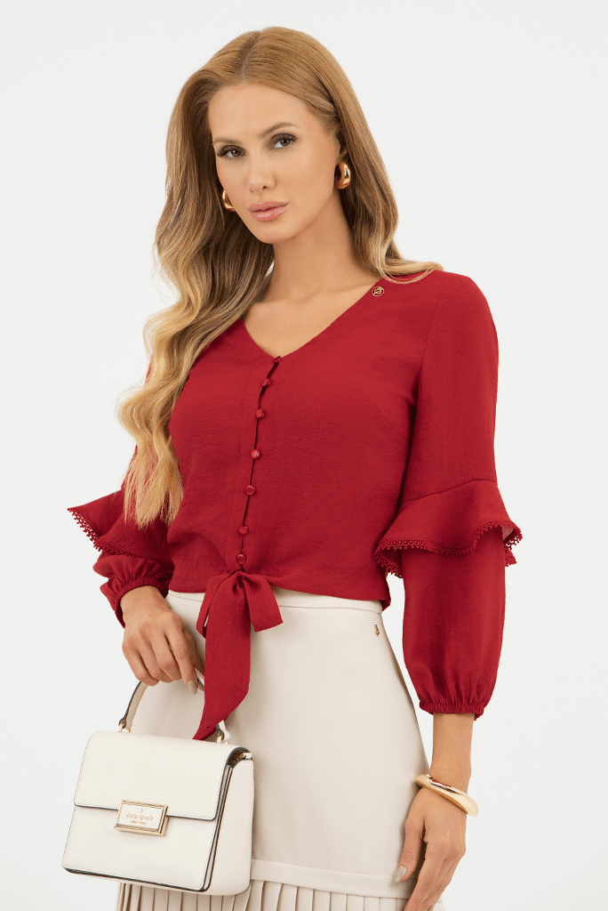 Blusa Vermelho Plano Com Amarracao E Mangas 3 4