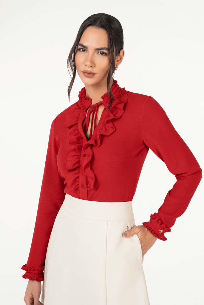 Camisa Vermelho De Crepe Com Detalhes De Babados Via Tolentino