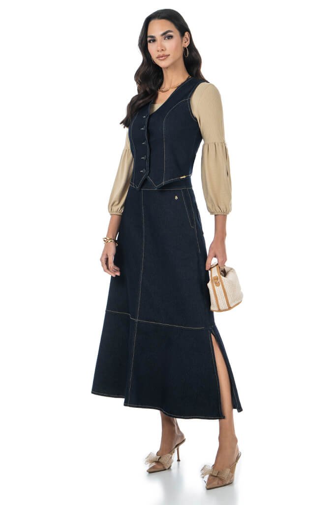 Conjunto Midi Jeans Com Bolsos E Recortes Via Tolentino