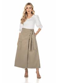 Saia Em Sarja Transpassada Com Bolso Cargo Caqui Via Tolentino