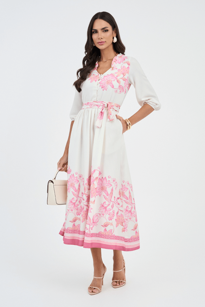 Vestido Rosa Estampado Midi Godê